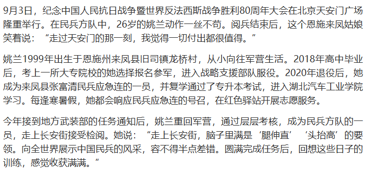 【湖北日报】聚焦九三阅兵 | 受阅湖北女民兵姚兰:走过天安门那一刻,觉得一切付出都很值得