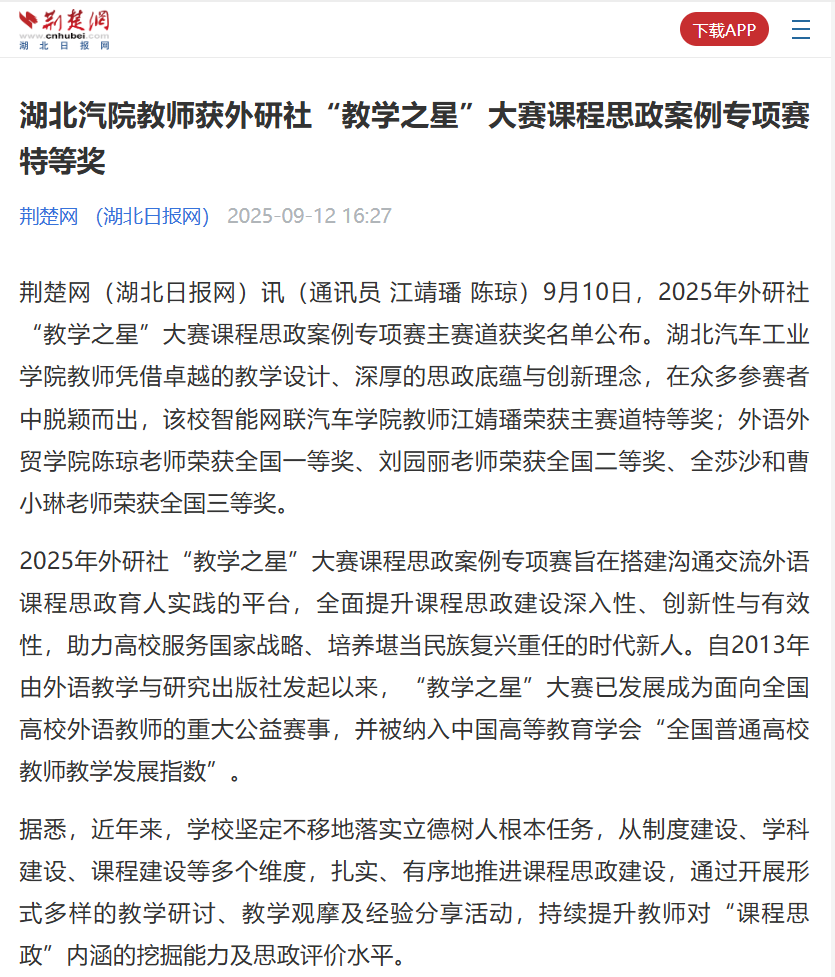 【荆楚网】湖北汽院教师获外研社“教学之星”大赛课程思政案例专项赛特等奖